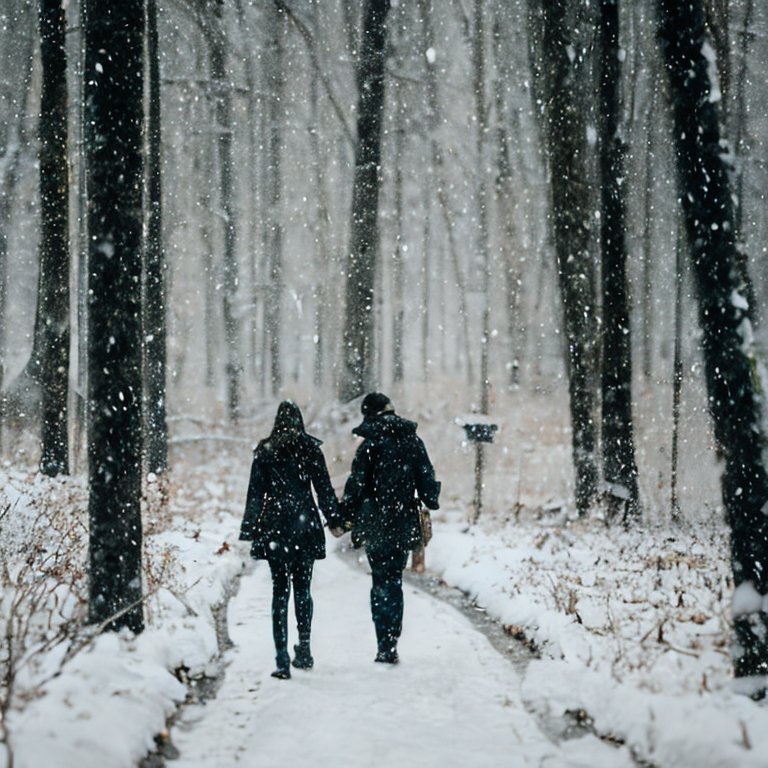 A couple walking through a forest during a snowstorm.