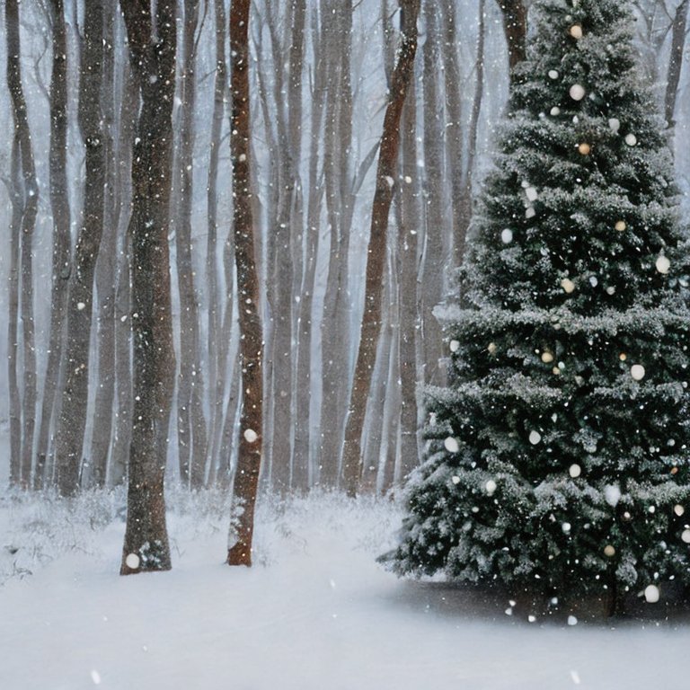 A Christmas tree in the forest during a snowstorm.