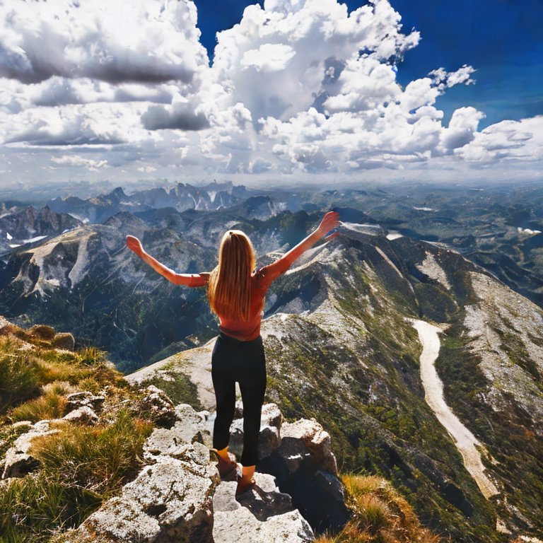 A woman standing at the summit of a mountain.